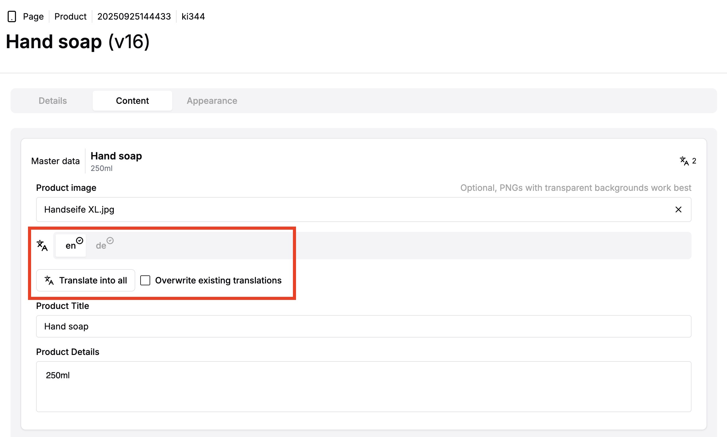 If you open the “Master data” card, it reveals its language settings, allowing you to e.g. translate the Product Title and Product Details.