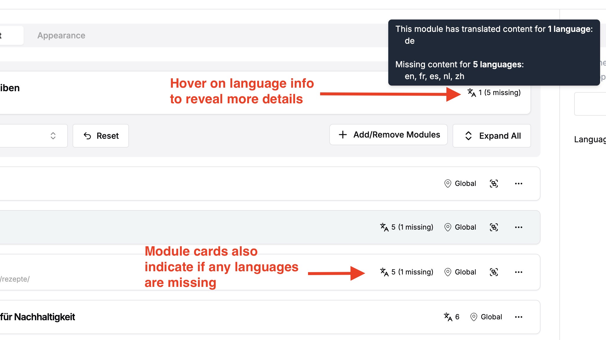 If you hover over any language information, a tool tip will give you more details, e.g. which languages are still missing. See screenshot below: